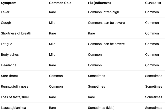 Cold, Flu, or COVID-19 Symptom Comparison Chart: